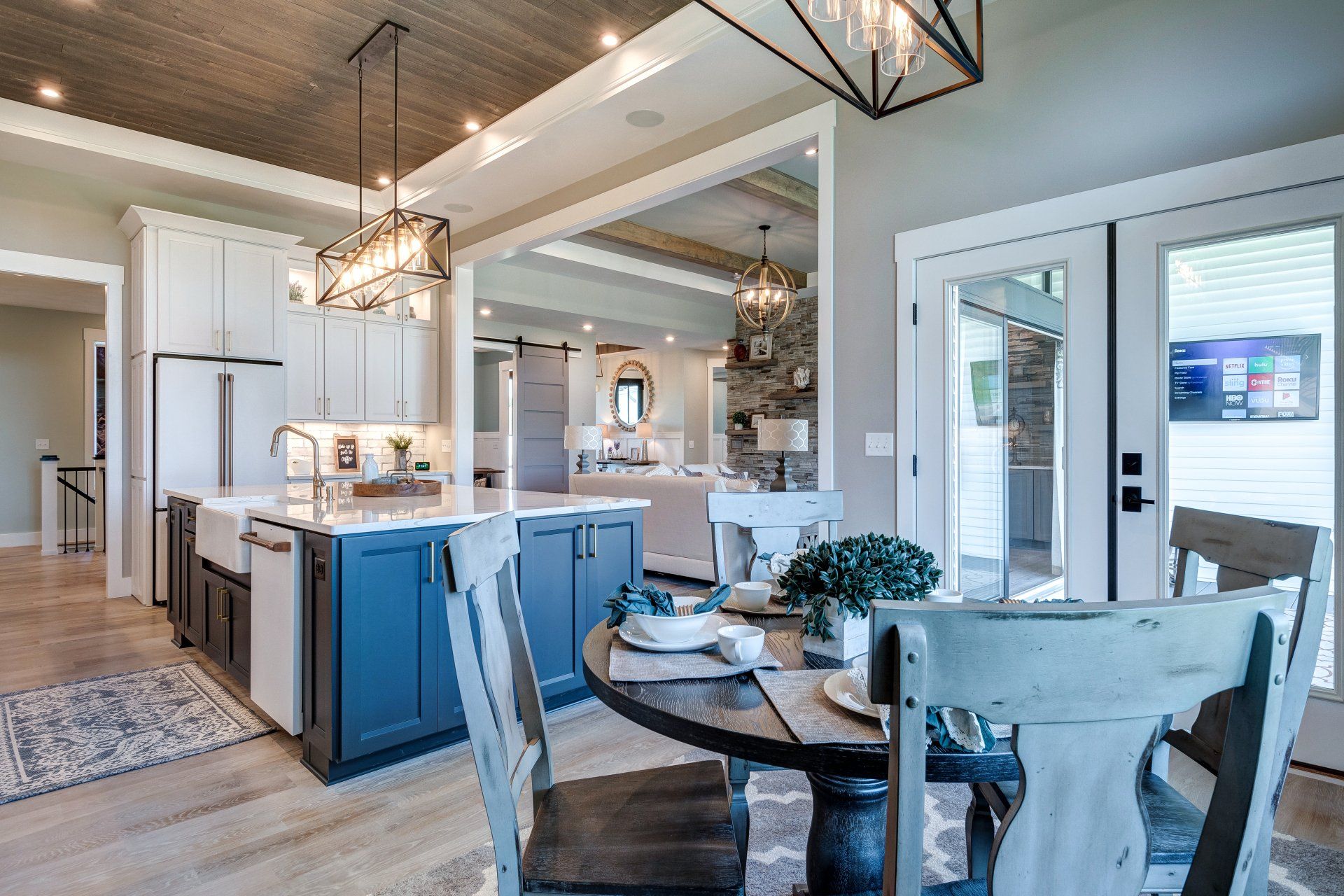 • Dining room with glass wine cellar, table with 2 seats, and chandelier