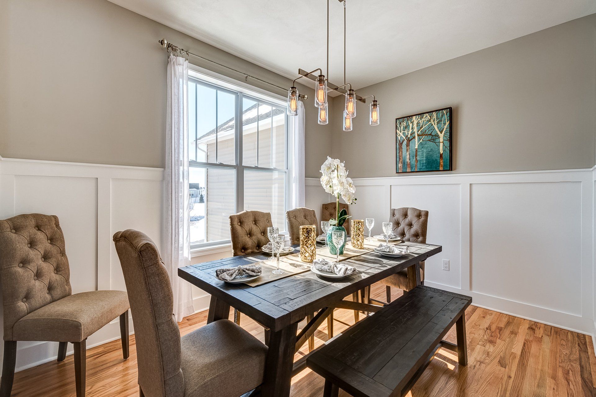 • light fixture above 6 person dining room set with bench