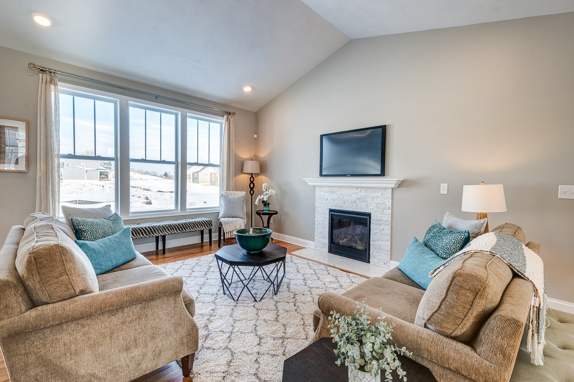 • living room with fireplace and vaulted ceilings