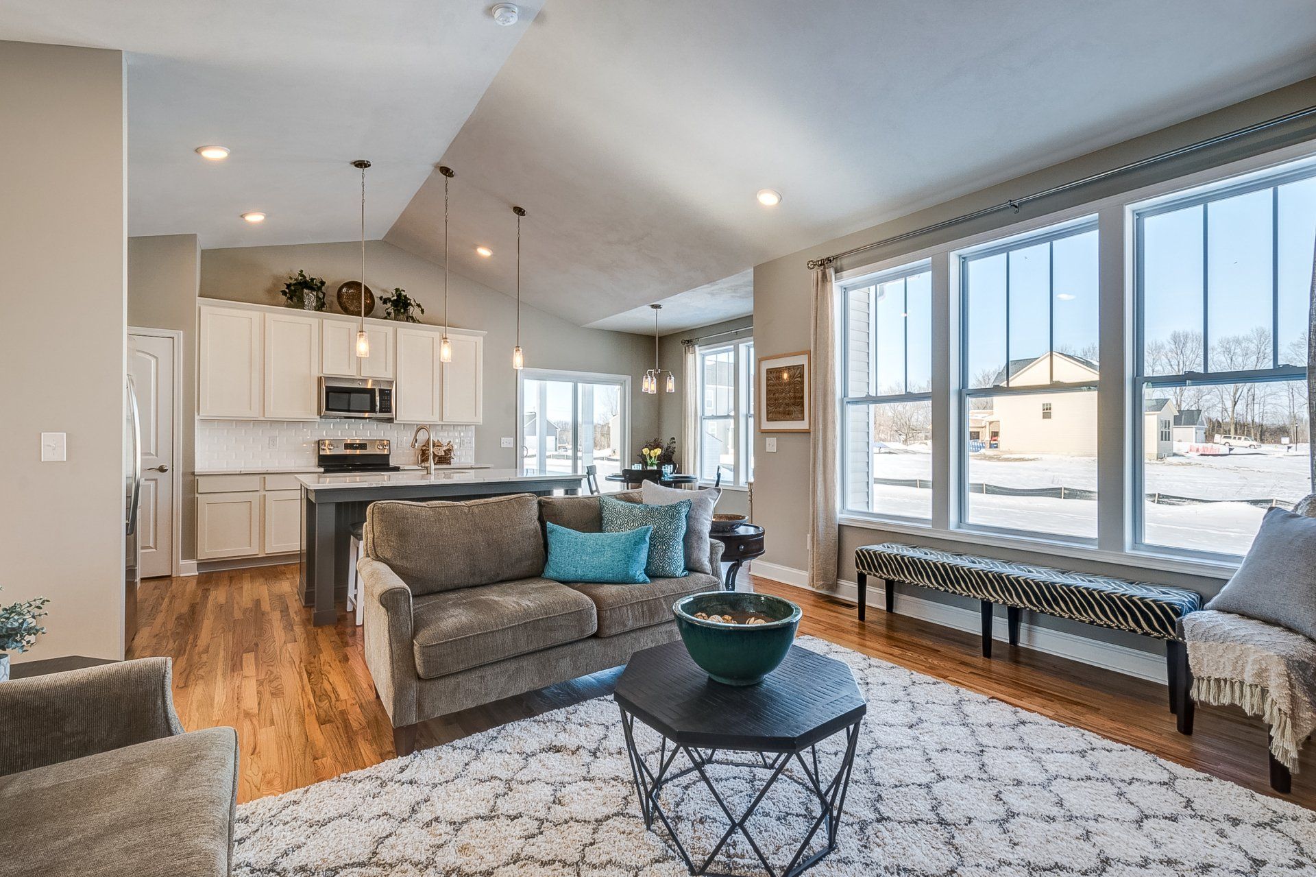 living room and kitchen with vaulted ceilings
