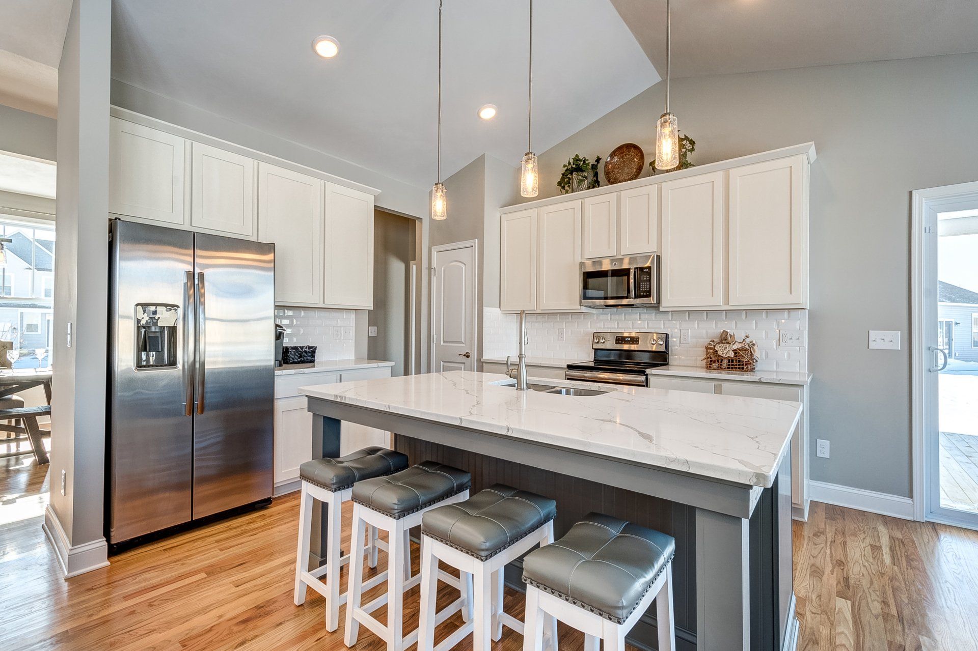 • pendant lighting above kitchen island with seating