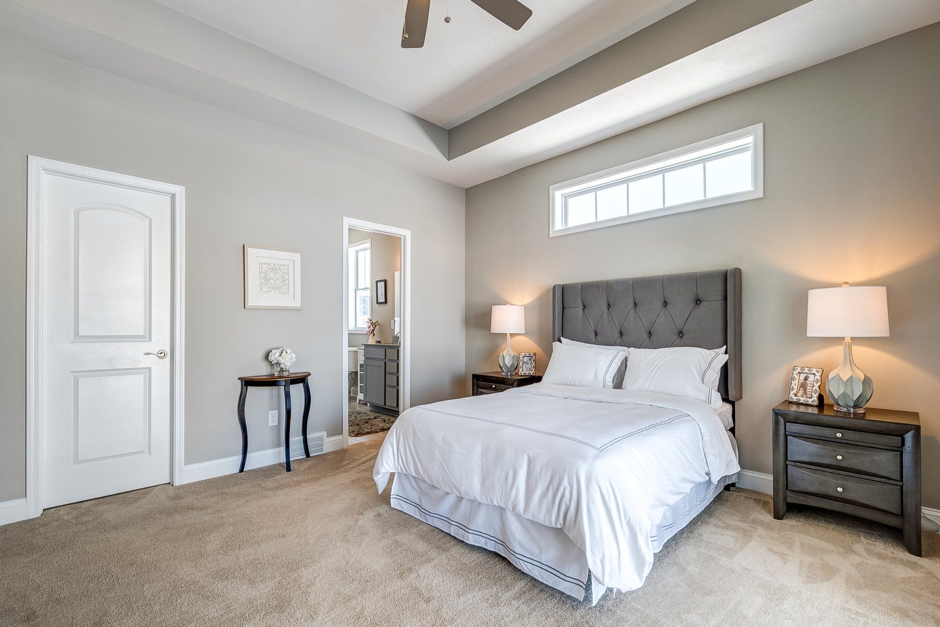 • primary bedroom with recessed ceiling and fan